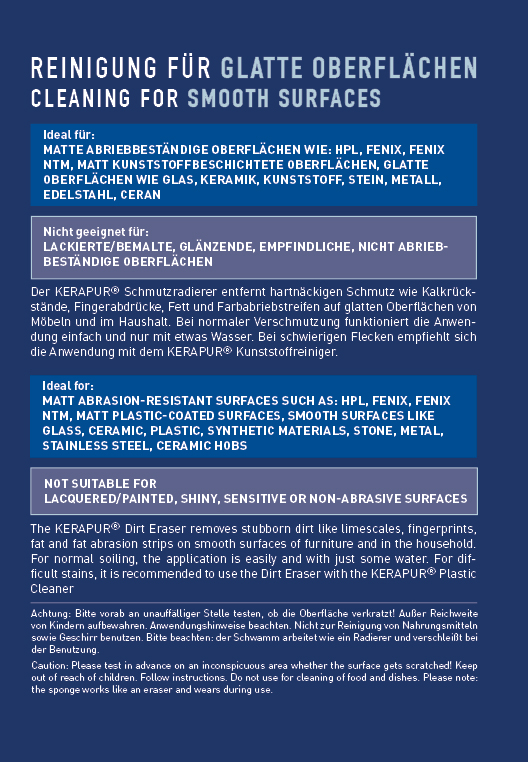 „Der KERAPUR® Schmutzradierer zur Reinigung glatter Oberflächen entfernt selbst hartnäckigen Schmutz auf schnell und einfach nur mit Wasser, spart Zeit und schont gleichzeitig die Oberflächen, was ihn zum perfekten Reinigungshelfer für jeden Haushalt macht.“